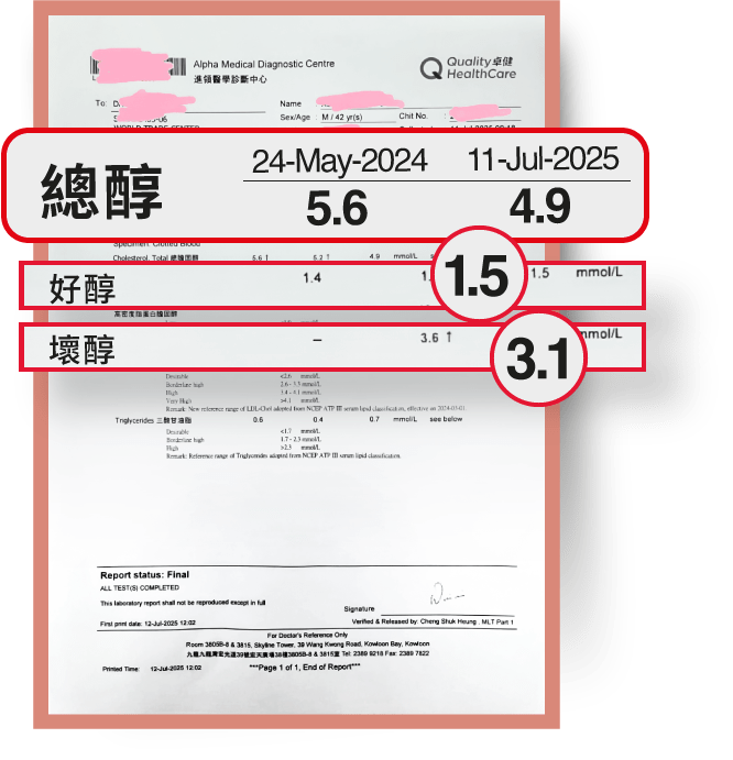 用家服用《御藥堂破壁靈芝孢子》後,總醇從略高於正常範圍(<5.2 mmol/L)的5.6 mmol/L顯著下降至4.9 mmol/L;壞醇則從3.6 mmol/L降至3.1 mmol/L,回到正常範圍;好醇亦從1.4 mmol/L升至1.5 mmol/L,有利於清除血管內的壞醇,避免血管健康問題。這一實測案例充分證明該產品在調節三高指數方面的顯著成效,帶來令人振奮的健康改善。