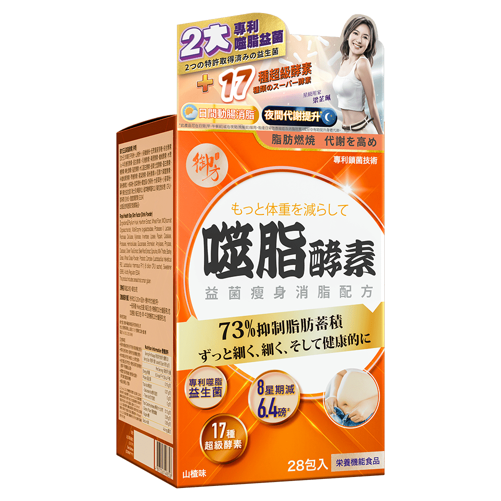 噬脂酵素結合雙重專利益生菌,多元膳食纖維及天然消化酵素,全面軟化宿便,平衡腸道菌群,改善腸道健康,並加速碳水化合物與脂肪分解,同時能緩解脹氣、減輕消化負擔,並有助抑制脂肪囤積及控制熱量攝取,從根本告別肚腩,輕鬆重塑平坦小腹與自然曲線。
